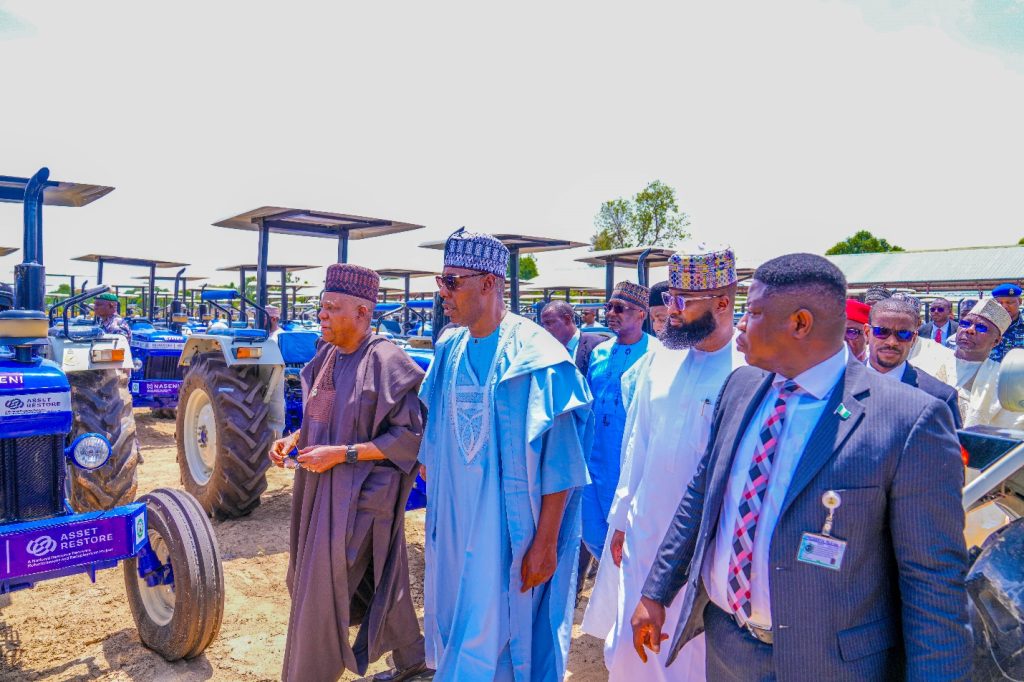 L-R: The Vice President, Kashim Shettima; the governor of Borno State, Prof.  Babagana  Umara Zulum and the Executive Vice Chairman/Chief Executive of NASENI, Mr. Khalil Suleiman Halilu during the launch of  over 375 state-of-the-art tractors under the National Asset Restoration Programme (NARP).
